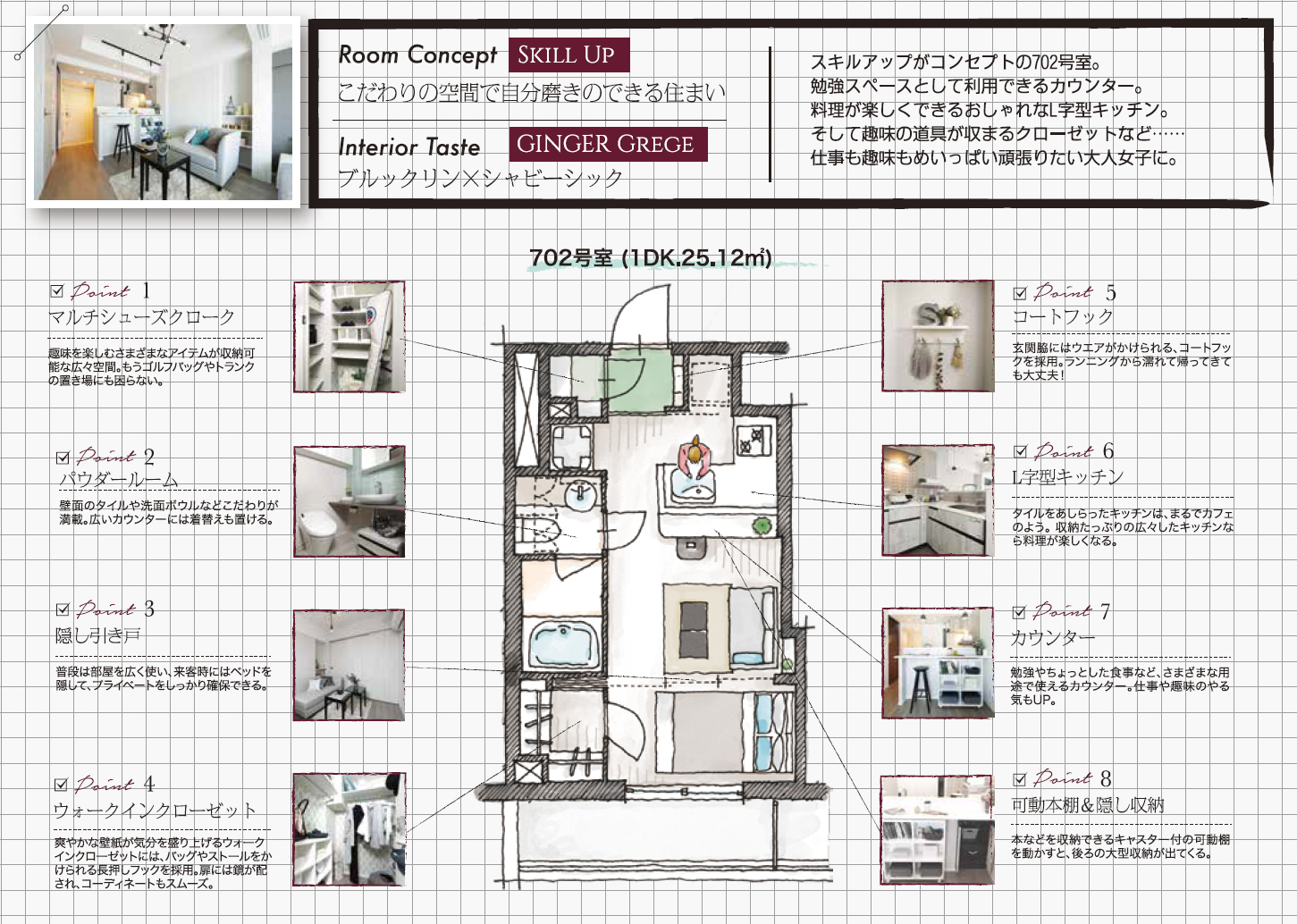 セラピータイプ スキルアップタイプ 疲れて帰ってきたカラダを癒す充実のバスルーム。忙しい日々でも効率よく料理ができるこだわりのキッチン。さらにはストレスフリーの収納など……美容や健康にも気を使う大人女子に。 セラピータイプ スキルアップタイプ 勉強スペースとして利用できるカウンター。料理が楽しくできるおしゃれなL字型キッチン。 そして趣味の道具が収まるクローゼットなど……仕事も趣味もめいっぱい頑張りたい大人女子に。